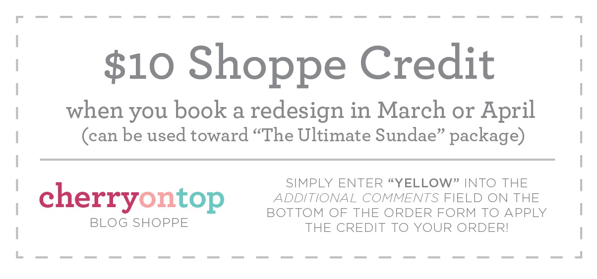 Visit Cherry on Top Blog Shoppe and then leave a comment below with a sentence of what colors their “dream blog design” would consist of!