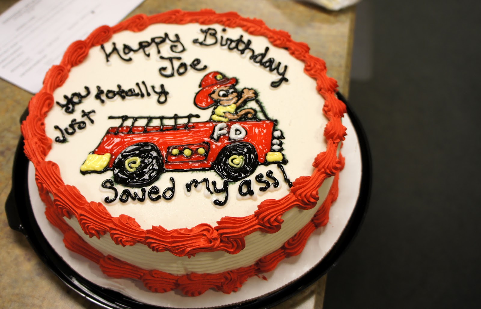We had all decided it would be funny to order a cake with a fire truck on it in honor of his latest pyro skills.