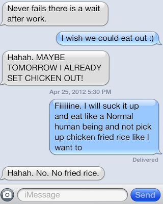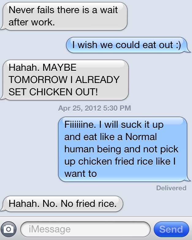 –Go sit in the lobby at the tanning bed for a solid 20 minutes surrounded by orange teenagers. The only thing that seemed to remedy the situation was to text my husband about my cravings for chicken fried rice.