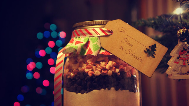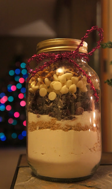 Layer flour mixture, brown sugar, granulated sugar and M&Ms-brand candies in jar. Pack firmly.