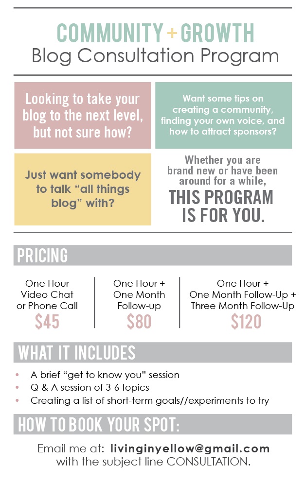 By cutting down my options to the above, it allows me to spend more time on my new favorite baby of blogging—consulting. I had my first session