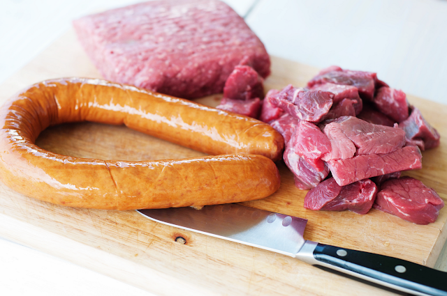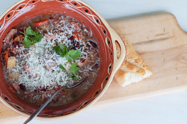 You’ll also need beef broth, olive oil, salt, red pepper, kidney & pinto beans.