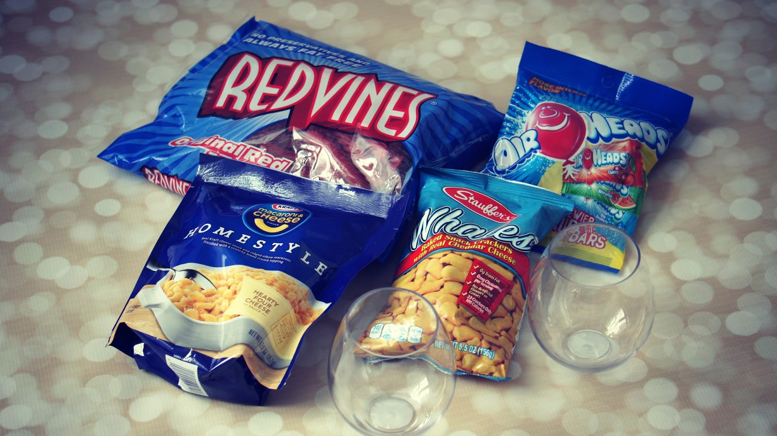 Red Vines//Mac & Cheese//Air Heads//Whales Crackers//Two Stemless Wine Glasses
