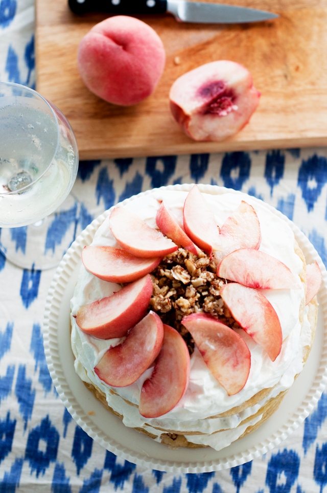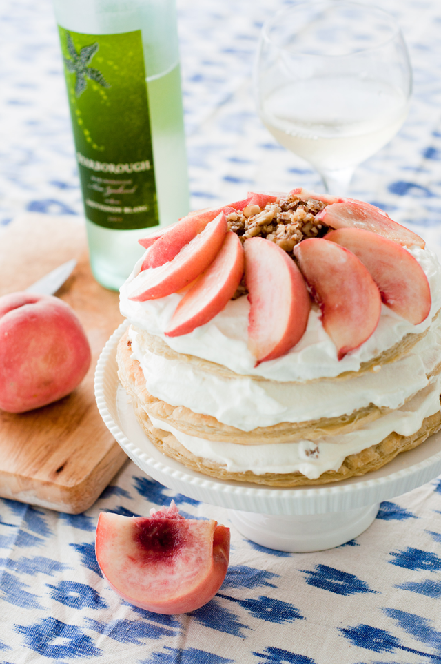 Using a bowl & knife, cut the pastry dough into 3 circles; bake according to package. Once they have cooled, spread 1/3 of the honey almond mixture on the first pastry layer. Next spread 1/3 of the whipped cream. Add another pastry layer, continue with the honey almond & whipped cream. Spread the remaining whipped cream on the last pastry layer, the remaining nuts in the middle and peach {or your seasonal fruit} slices around the edges.