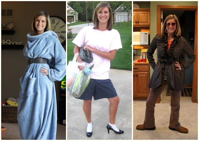 Last but not least, my classic “go to” choices. Snuggies, Swishy shorts straight from my mom’s closet, and again..my husbands shoes. All of which leave a nice level of room for growth.