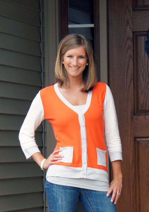 First item up for bid was this color block cardigan comprising of all colors orange, grey, and white. My husband thought it needed “one less color” as three must be just absolutely crazy, however I disagree. The more color the better…that’s what I say.