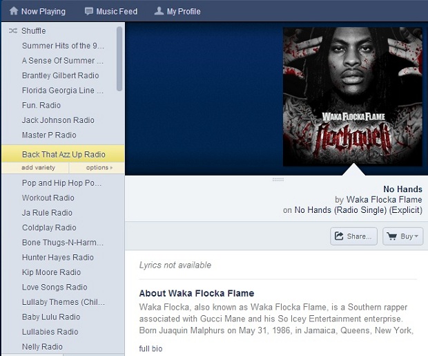 I wonder what this “No Hands” song is all about on Pandora right now? Or who Waka Flocka Flame is and why his momma named him that?