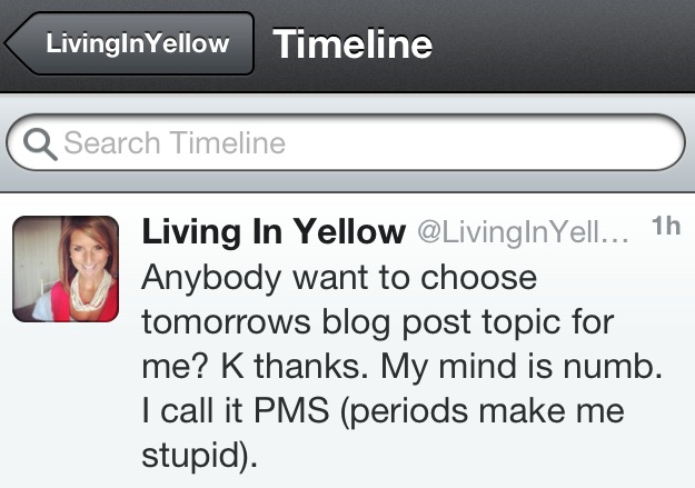 And that my friends, completes blogging according to Twitter. Thank you for all of the great suggestions. Perhaps we should do this again sometime? See you in about 28 days. That’s the normal length of my cycle according to my app that keeps track of all of this womanly stuff.