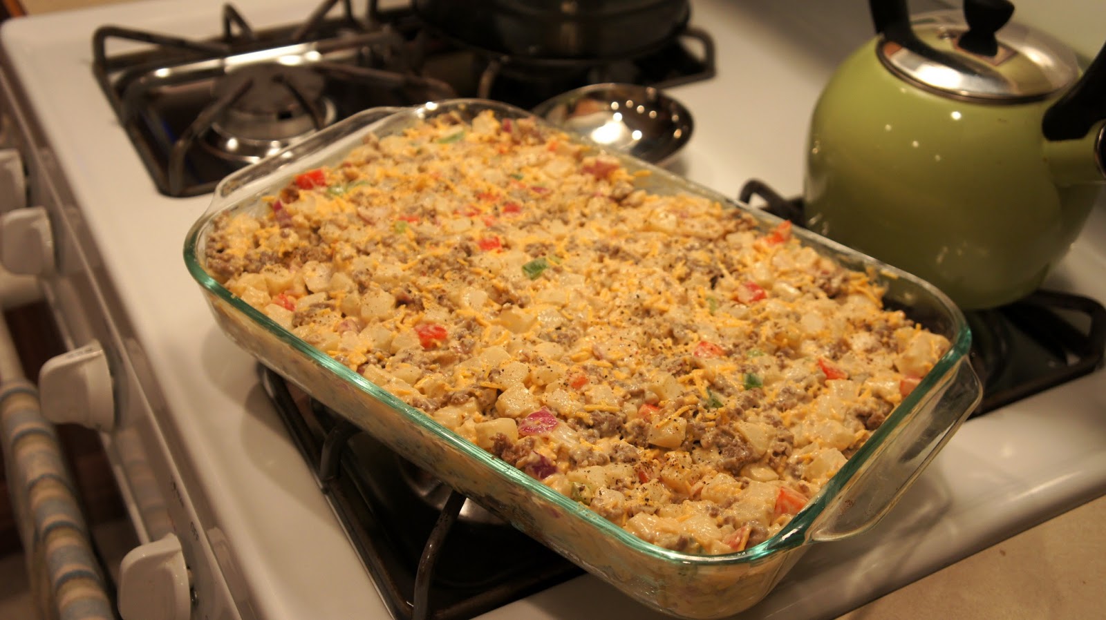 You know those evenings that you are extremely busy and the only time you have to think is while you are busy making a breakfast casserole to take to work in the morning? Well tonight was one of those nights.In the middle of my casserole making thoughts it dawned on me that I needed a topic for today’s post. Behold the topic of today’s post–sausage hashbrown casserole. Also known as my favorite thing eat for breakfast. Ever. Before we begin, is it hashbrown or hash brown? Do things like that really even matter? Anyhow, I am not an egg fan by any stretch of the imagination so breakfast casseroles have always been a bit anticlimactic for me. Until this sucker magically appeared in my life that is. Potatoes, sausage, veggies, and cheese.Does life need any other ingredient? Yes. Sour cream, so we threw that in there as well. Here is the recipe peeps. Make it, love it, repeat, and repeat. Sausage Hashbrown CasseroleIngredients:2 pounds sausage (I used one pound spicy and one pound medium)1 cup sour cream1 can cream of chicken soup1 can french onion soup1 cup onion1/2 cup red pepper1/2 cup green pepper2 cups shredded cheese 30 oz country style hashbrownsSalt and pepper to tasteDirections:1. Brown the sausage2. In a separate bowl combine all of the other ingredients. Add in the sausage. 3. Pour into a 9×13 pan and bake for 45-60 minutes at 350.