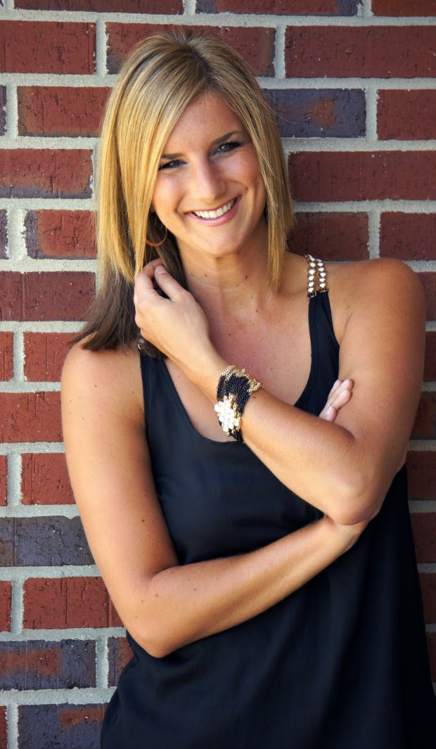 Being that this month is a celebration of sorts, we wanted something that had a celebration/night out vibe to it. I couldn’t be more obsessed with this black tank which has a fun white and gold beaded back. Add in the black & gold rhinestone bracelet and the combination couldn’t be prettier. I chose to wear it with black pants but I promise you it looks even more striking with white. I am almost embarrassed in advance for how many times I will be wearing this tank and bracelet over the next few months.