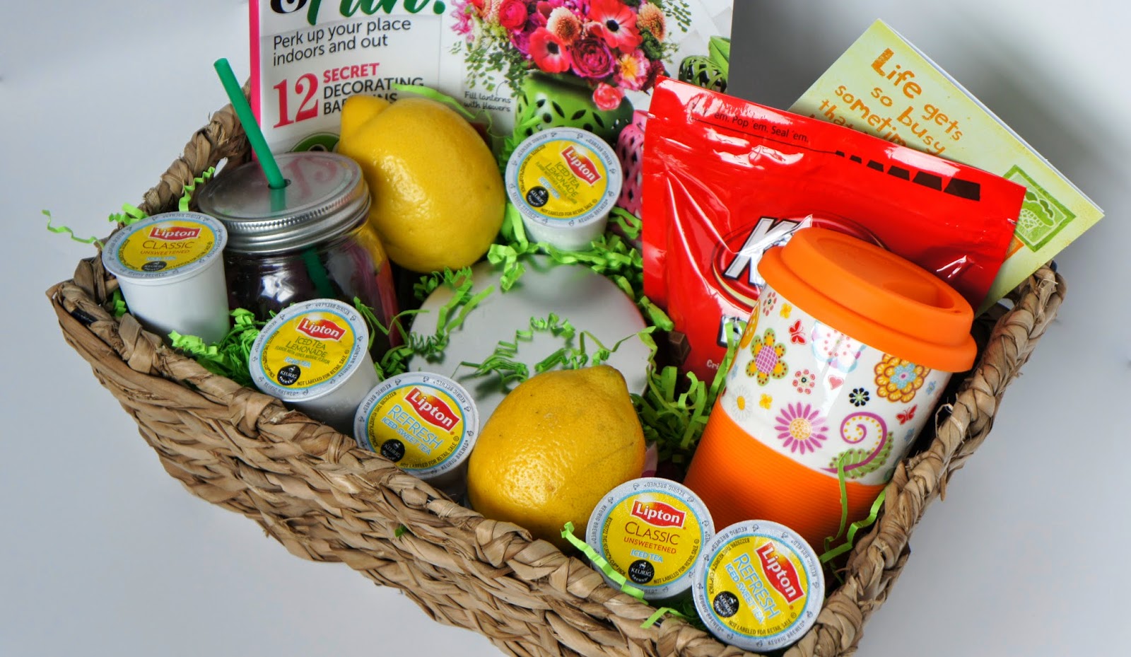 Needless to say when I found these Lipton Keurig K-Cups I knew it was time to do something nice for somebody else, my sister especially. She is a huge fan of sweet tea and is also a mother to two of the world’s most hyper [but cute] children so I figured it was time she needed a treat of her own. After I gathered up a variety of Lipton K-Cups [they can be found online and in store at retailers nationwide-they have flavors ranging from sweet tea, unsweetened, iced tea lemonade, chai, etc] I headed off to the extravagant store that is Dollar General and found a mason jar for tea over ice, a travel mug for hot tea, magazine, kit kat bars, a candle, a few lemons to sweeten the tea, a card, and then bundled it all up together in a cute little basket.