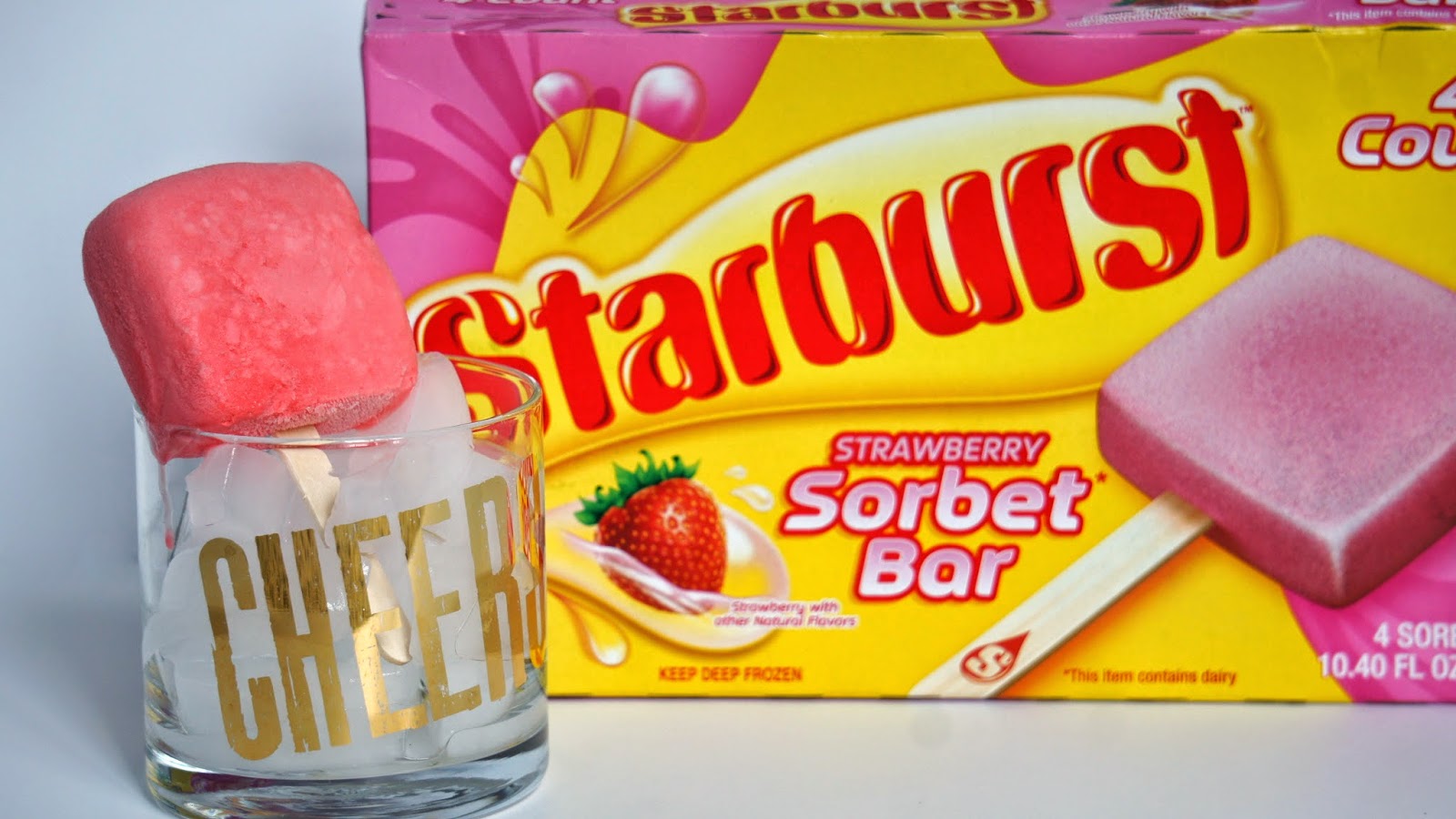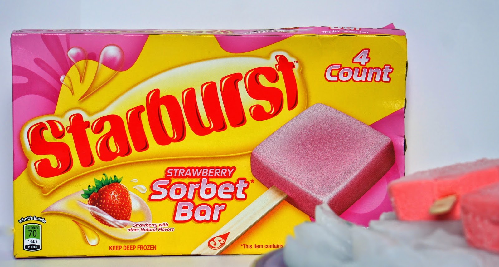 It’s time to share with the world what the world has been missing–Starburst Sorbet Bars. You read that correctly, Starbust [as in the fabulous chewy delicious squares of goodness] has recently come out with a Strawberry Sorbet Bar and they are as refreshing and heavenly as they sound. I recently found these babies in the freezer section of Walmart which resulted in a text to my husband of something like “OMG. THERE ARE STARBURST POPSICLES NOW!” which obviously resulted in a response of “BUY THEM NOW” because food is a very big deal to us.