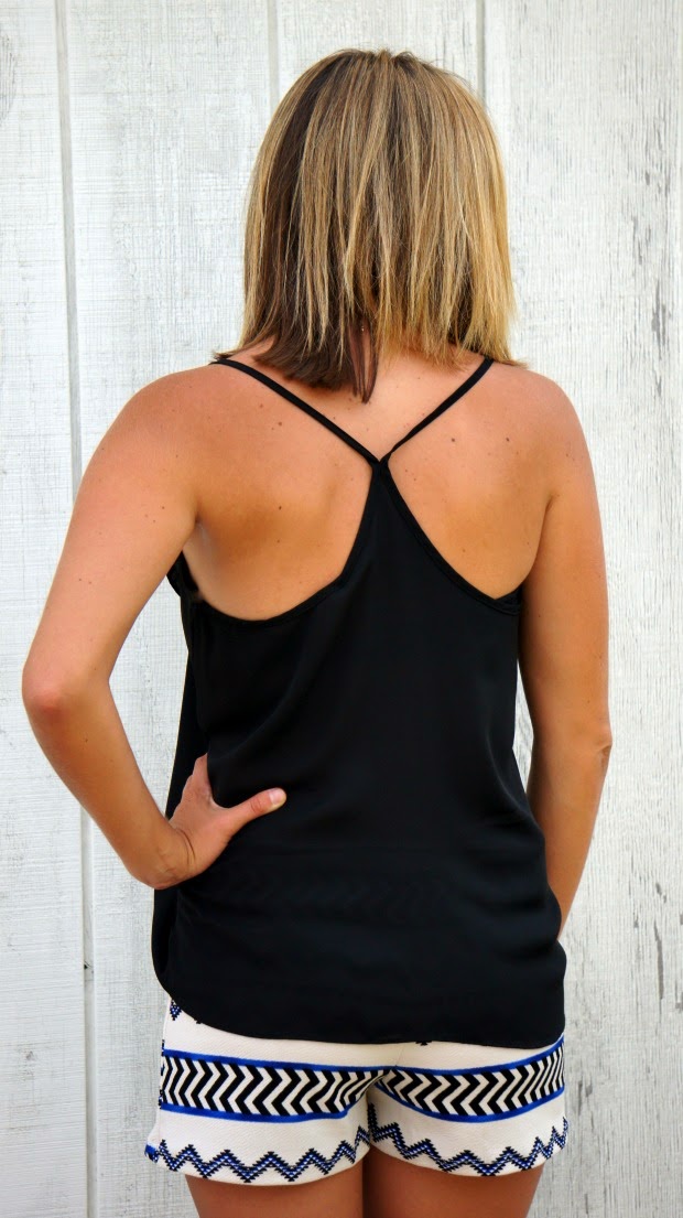 Lets start with the tank—a basic black ruffle which can be worn so many ways it makes my head spin. Alone with these shorts–underneath a blazer for work–with white pants–and the list goes on. When you are dealing with black you are dealing with the world at your fingertips, that’s just how the story goes. Throw in some fun detail in the back and BAM, life is complete.