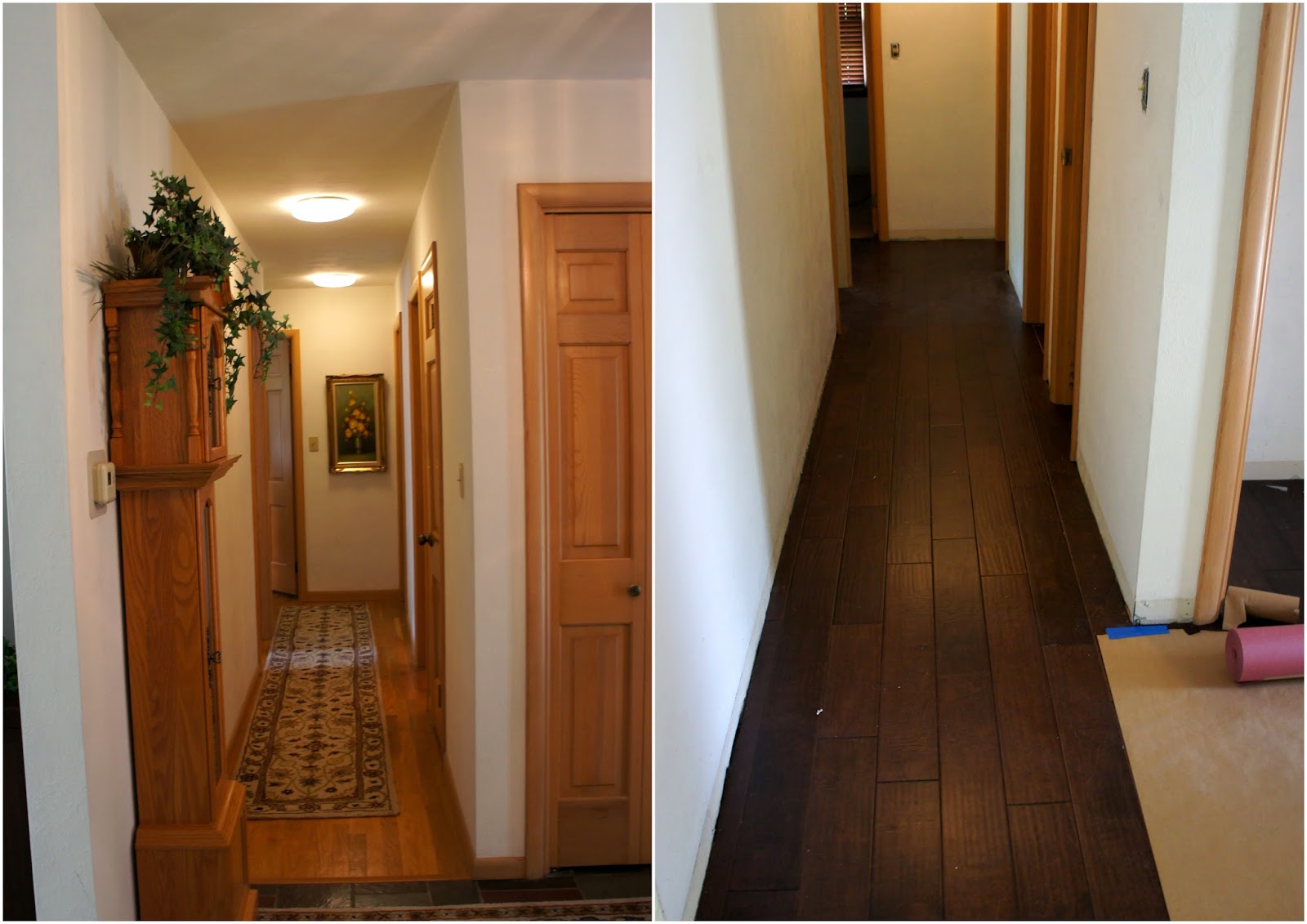 In the hallway, the only update currently is the flooring. Still need baseboard trim added and the remaining trim and walls to be painted. Have no fear, new light fixtures will be installed shortly here too.