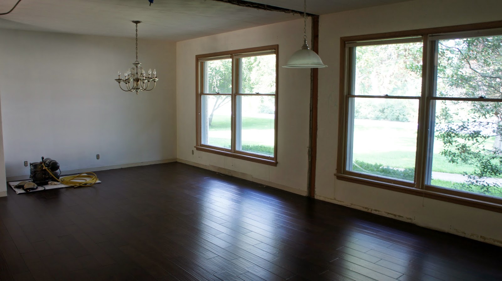 Since the above photos were taken our flooring has gotten (almost) all installed so you can catch a glimpse of what that will look like below. I am already so thankful we decided to knock down that wall to open up the space. I am totally digging the giant windows as well. To be completed still: add baseboard trim, paint all existing trim white, add board and batten on the dining room wall, paint all walls, remove and change out light fixtures, have all new cabinets and appliances installed, smack a 7 foot center island somewhere in there, and call it a day. Stay tuned party people.