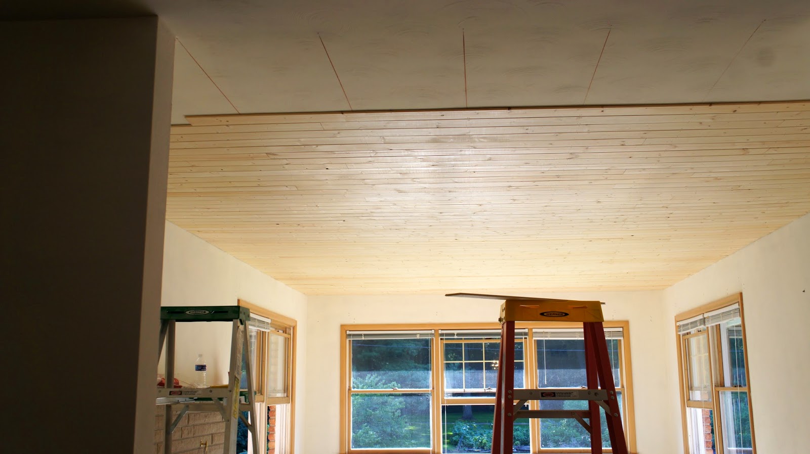 While I have hardly any pictures of the current state, the only things that have been done so far is the wood plank ceiling has been hung and the hardwood floors you saw up above have continued their way into this room as well. Oh and I bought a fun fan which will call this room home. Canned lights to be installed along with the walls and trim that still need to be painted. Oooooh yes, the ceiling–that baby will be white washed one of these days.