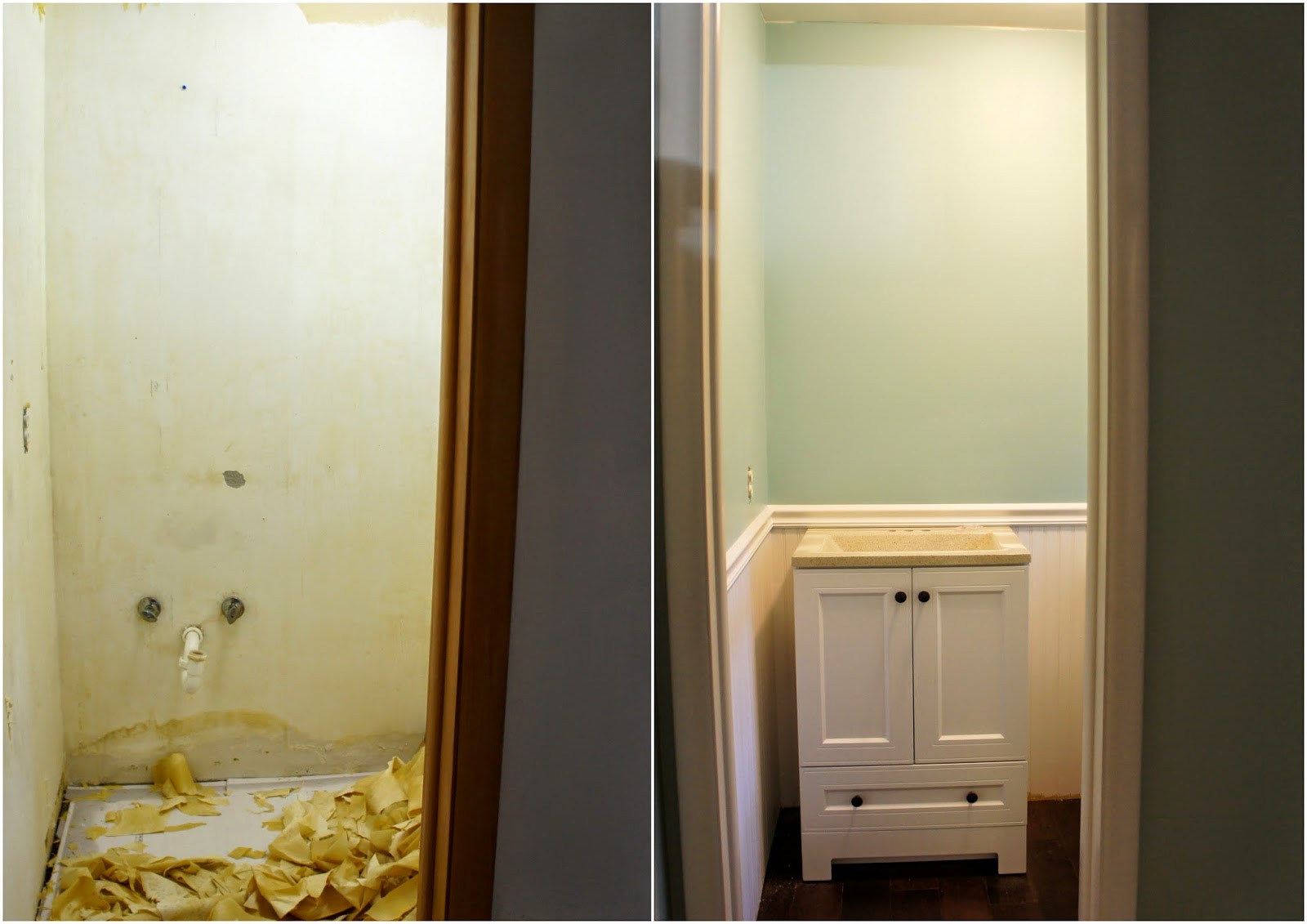 As for the half bathroom, as you can see on the left from the last time I showed her off, she had a heaping pile of Hell [also known as wallpaper] that had just been stripped and laying on the ground. We since installed beadboard [go husband go] and painted the wall up above it. She is waiting [very patiently] on baseboard trim to be installed, a mirror to be hung, and crown molding to be installed but like we keep telling every other room–it will happen. soon. just not soon enough.