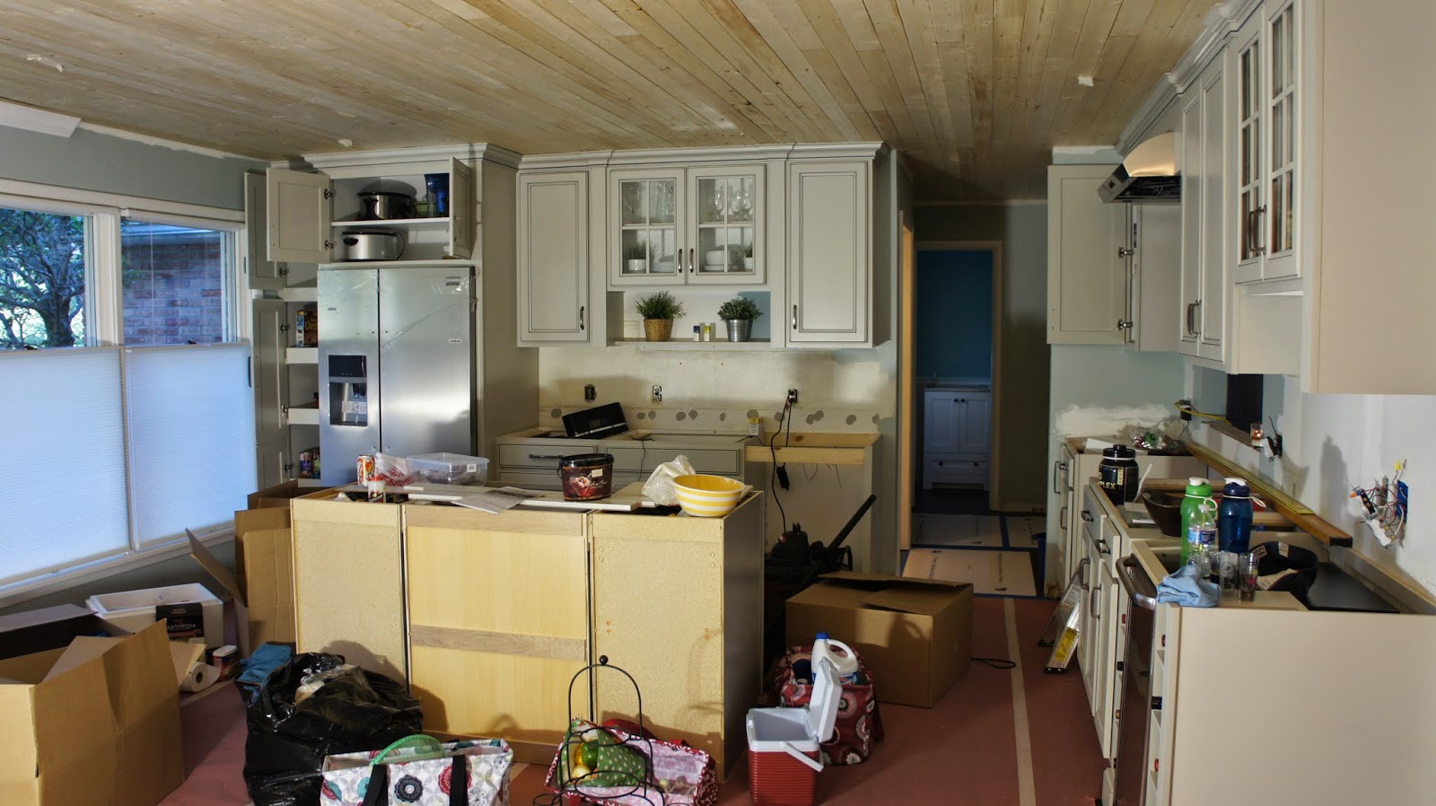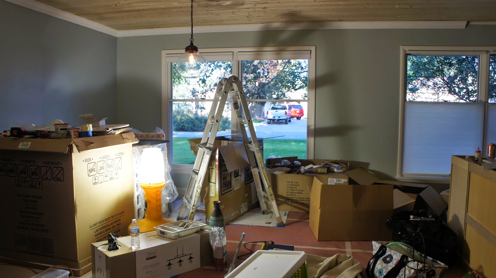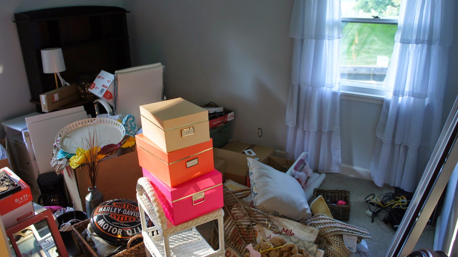 It’s safe to say I have stepped on nearly every item we own, I have cut my fingers on countless who knows what, and I have sworn in my head 232 times when trying to find something I need. For example, making coffee currently looks like this — I head to the living room where the Keurig is plugged in and sitting unevenly on top of a wicker chest. I then grab the water filter, head to the bathroom sink to fill it on up [because that’s appetizing], then I make my way to my office where I have to crawl over what seems to be three thousand boxes before I find the one with the K Cups. Head back to the living room and then remember I need a coffee mug still. Two hours later I locate the coffee mug that is laying in a Target plastic bag at the bottom of a box in the entryway closet. My morning coffee is now drank at around 7 pm because yes, it takes that long to make it. The only good news in all of this is that I am skippin’ out of town tomorrow so I don’t have to deal with this madness. Ignorance is bliss my friends. Here are some updated pictures of what it looks like around this joint. A little room by room tour if you will…