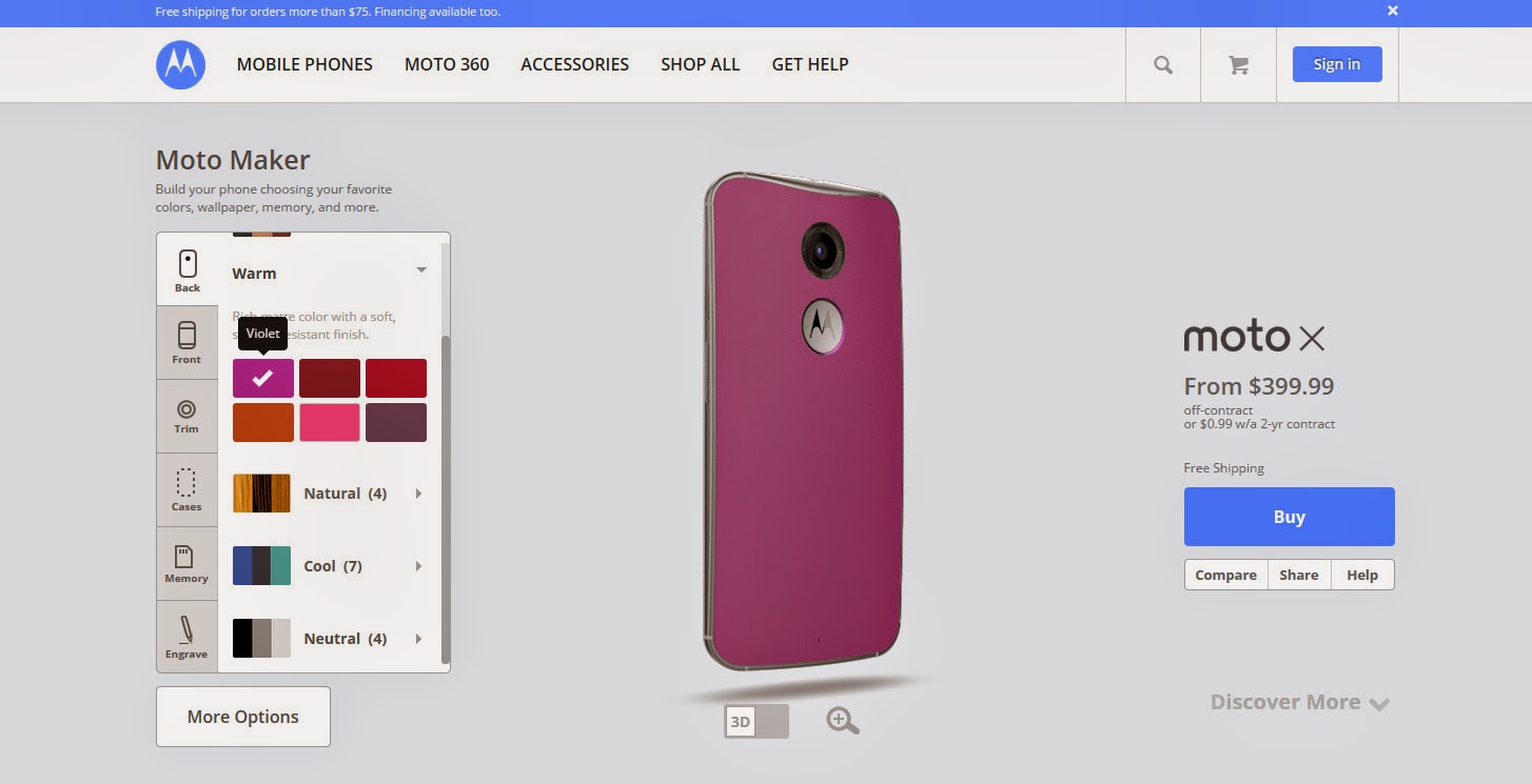MotoMaker.com is the online studio where you can design your Moto X. You choose the colors, leather or wood and decide all the details: front, back, accents, memory storage, wallpapers, even add a name or a short message that is laser engraved on the back. Here are a few screenshots of what the design process looked like for me. It’s so easy and fun, I wanted to design twelve billion of them.