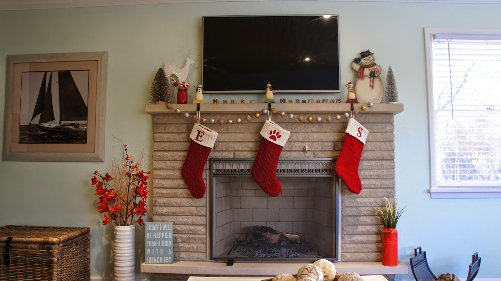 As you can see, it was very white. White walls, white ceiling, white carpet, blah blah blah. Thankfully the real wood burning fireplace and seven large windows that flood the room with sunlight during the day made me look past the work that was going to have to go down to bring this space up to our liking. Here she is today with a little more color, texture, and spice to it.
