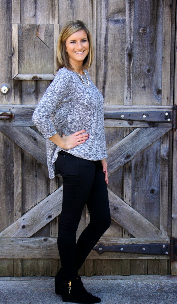 Now, onward to the more important issues at hand…the clothes (!!!!!!!!) The theme we were going for in January was basics + bling so to speak. I always love this combination as you can make it as dressy or as casual as you want. For the top I decided on this heathered grey sweater [which holy cow is the softest shirt I have ever owned and I am not just saying that] and then combined it with a fabulous statement necklace.