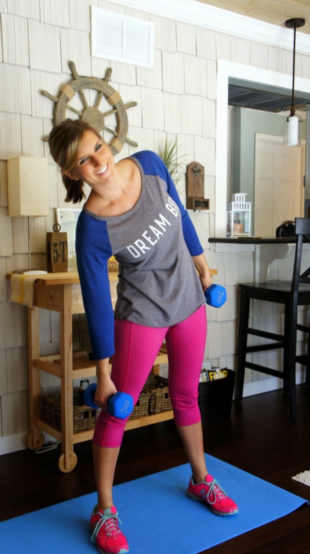 1. Lets start with that exercise featured above — the weighted oblique crunch. All you need is a set of weights (I typically range from 8-15 pounds per hand). Stand straight up, feet hip width apart – bend only at the waist and bring your weight down to your knee area. As you stand back up straight, exhale. Repeat on the opposite side. Keep switching back and forth for one minute. This one may not feel all that difficult while you are doing it, however you will fill it in your obliques the next day.