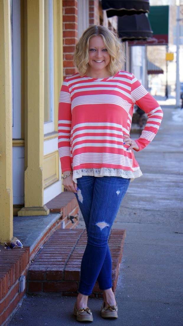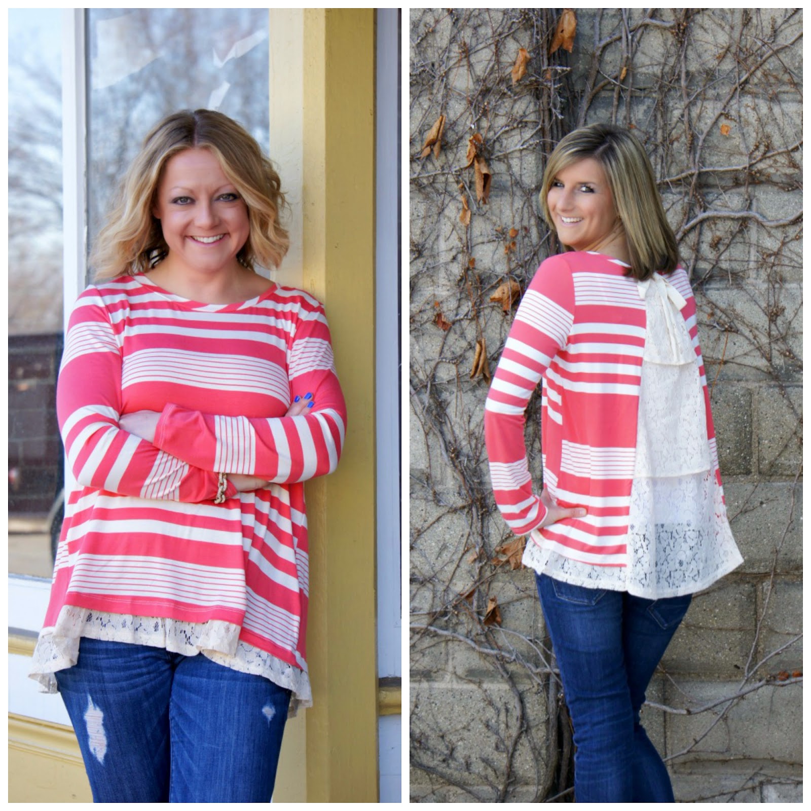 First up is this top. YOU GUYS. I wish I could have you put this thing on right now. It is such a great material and has the perfect amount of softness and bounciness to it. The added detail along the bottom plus the layered lace back makes this the perfect lovey dovey top without being too over the top [how many times can I say the word top]. Not to mention the romantic red/pink/coral color it has going on.