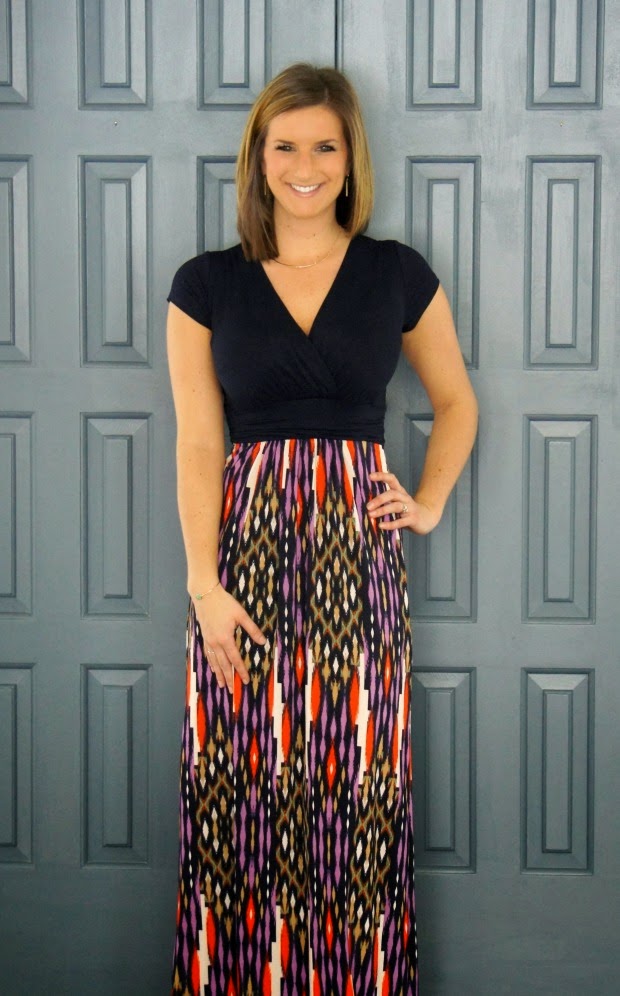 If you know me at all, you know I am a maxi addict. I should clarify, a maxi dress addict. #teamtampons. Even though I typically wouldn’t choose a vneck maxi for myself (it makes the ladies look rather large) I love the print of this dress. I also love that I can pair a jean jacket with it for a cool evening out. Props to maxis for changing the leg shaving game forever.
