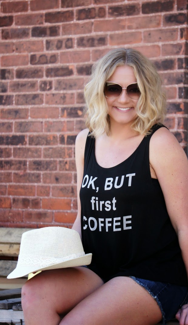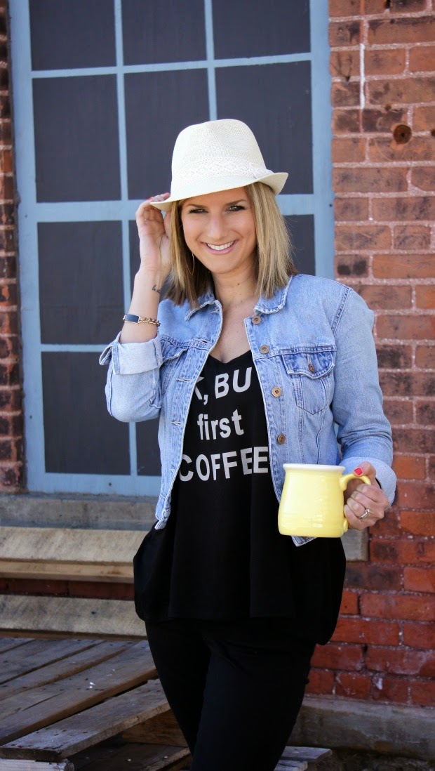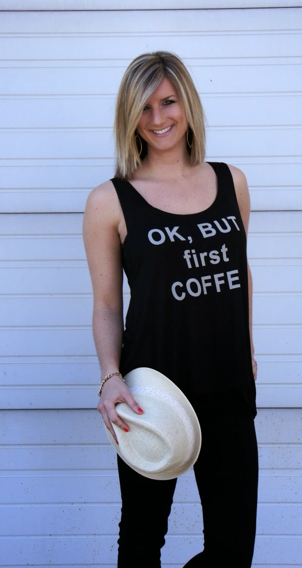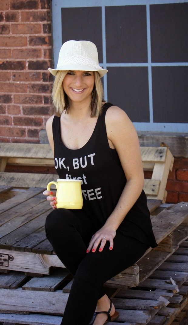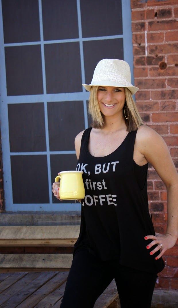 So that’s what we did. Being a coffee addict, I thought this tank couldn’t be more fitting and with this hat – it’s the perfect weekend outfit to run any and all errands in. Pair it with a denim jacket or blazer for a different look or wear it on its own…as the sign that I just hung in my hallway says, the world is your oyster.