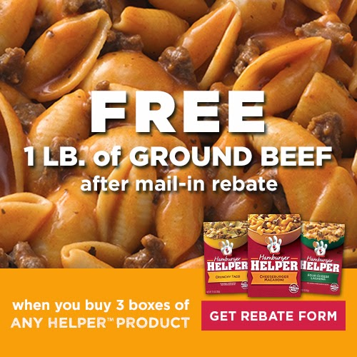 It turns out that there is a deal going on right now that when you buy 3 packages of Hamburger Helper, you will receive free pound of ground beef with a mail in rebate. I like to go big so I bought 4 — helllllo dinner for the next week. It would be rude if I didn’t tell you how to get your free pound of beef, so here you go.