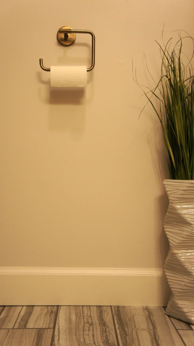 loved our kitchen cabinets and wanted it to match. We went with a grey vanity, white quartz counter, and then muted gold hardware. When I broke the news to Shawn that I wanted to do all sorts of gold accents in this bathroom, you can imagine the excitement on his face. You see, guys and gold…they just don’t get it. It’s similar to guys and Target. Only women posses the special bond between such things.