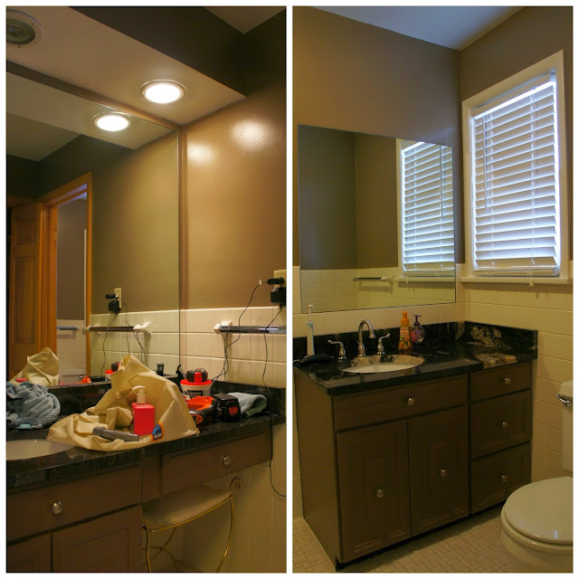I know. I can’t figure out why we ever wanted to do anything with it in the first place. I LOVE BROWN. After knocking down a wall, making this bathroom smaller so that our master bath could be bigger and doing a bunch of other dust creating jazz to it, here she is now…