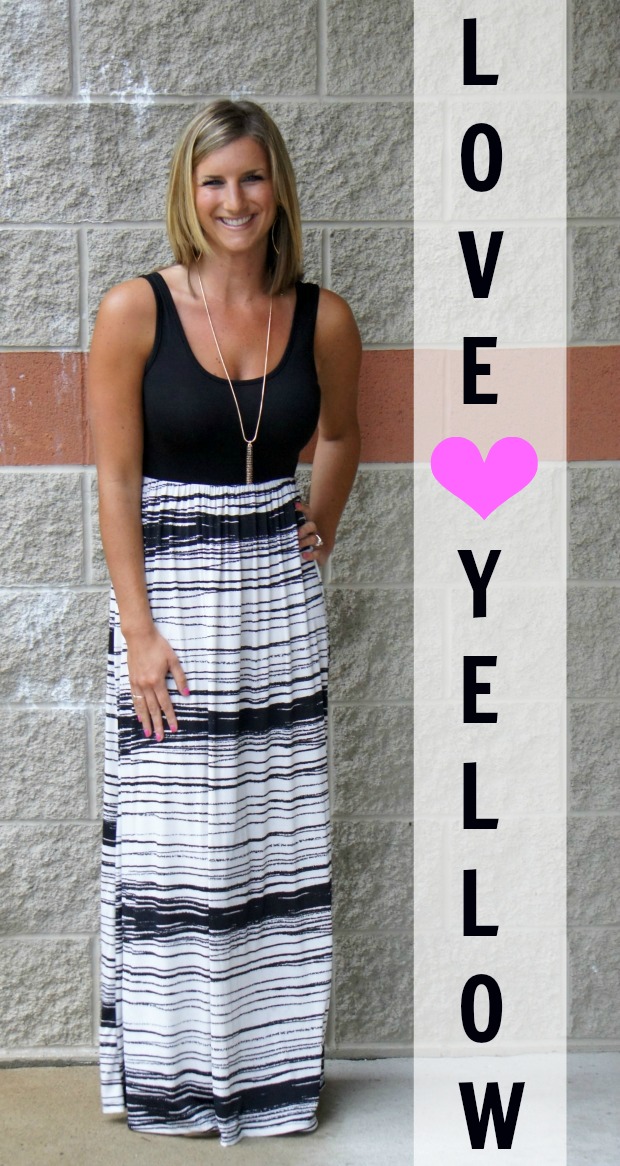 And now that I got that awkward sentence out of the way, it’s time for more of this month’s Love, Yellow reveal 😉 As you know I try to wear nothing but maxi dresses in the Summer months. You get the benefits of looking cute while not having to shave your legs. win/win I say! And to triple [or quadruple] that win I made sure of two things when choosing which maxi I wanted for you all this round — for starters, I chose a dress that a regular bra is acceptable. We all know my thoughts on strapless bras [straight from the devil] and secondly, underwear. I don’t like wearing it. While this dress isn’t lined on the bottom I still easily got away with going commando while having my ladies above my belly button. CAN LIFE GET ANY BETTER?