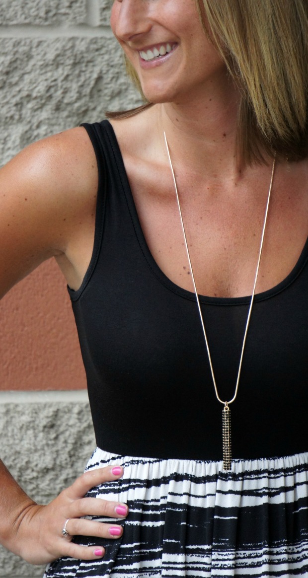 The black and white is totally classy [because obviously that’s what is important to me if you couldn’t tell from the last paragraph] and can be worn both day and night. To make it even fancier, we paired the dress with this lovely gold and black necklace.