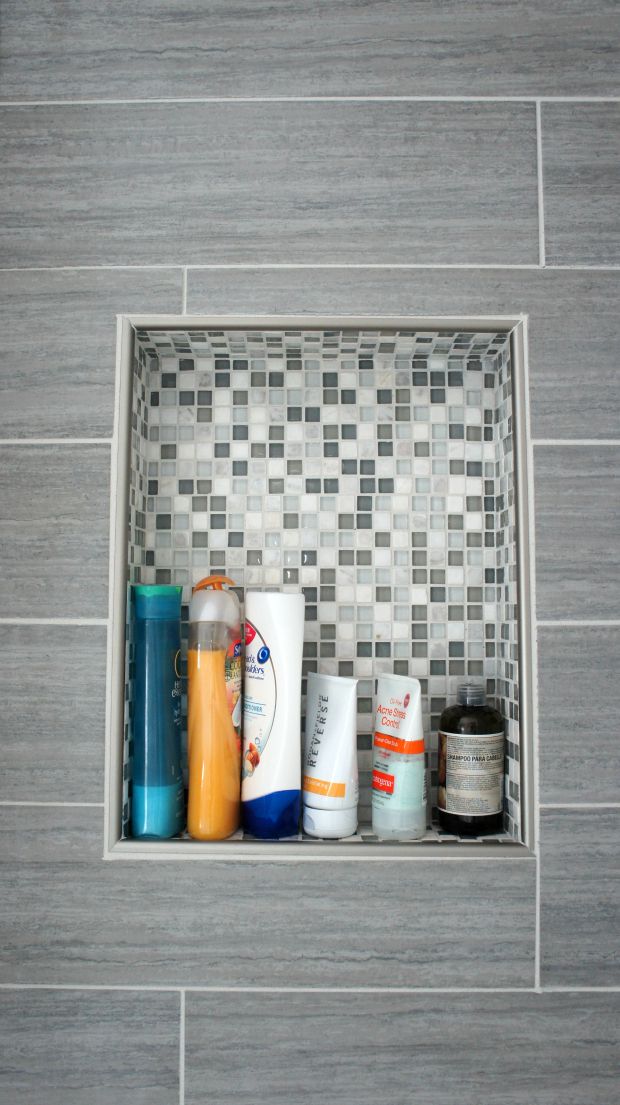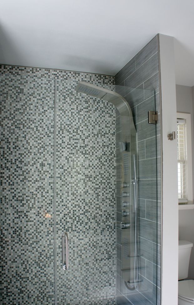 And now, onto my favorite part – the shower! We chose all tile and I had the idea of making the back wall feel a little bit like a waterfall, or at least the colors of water. I wanted this space to feel as spa-ish as possible. It broke up the floor and side wall tile and I love the statement it makes when you walk into the bathroom.