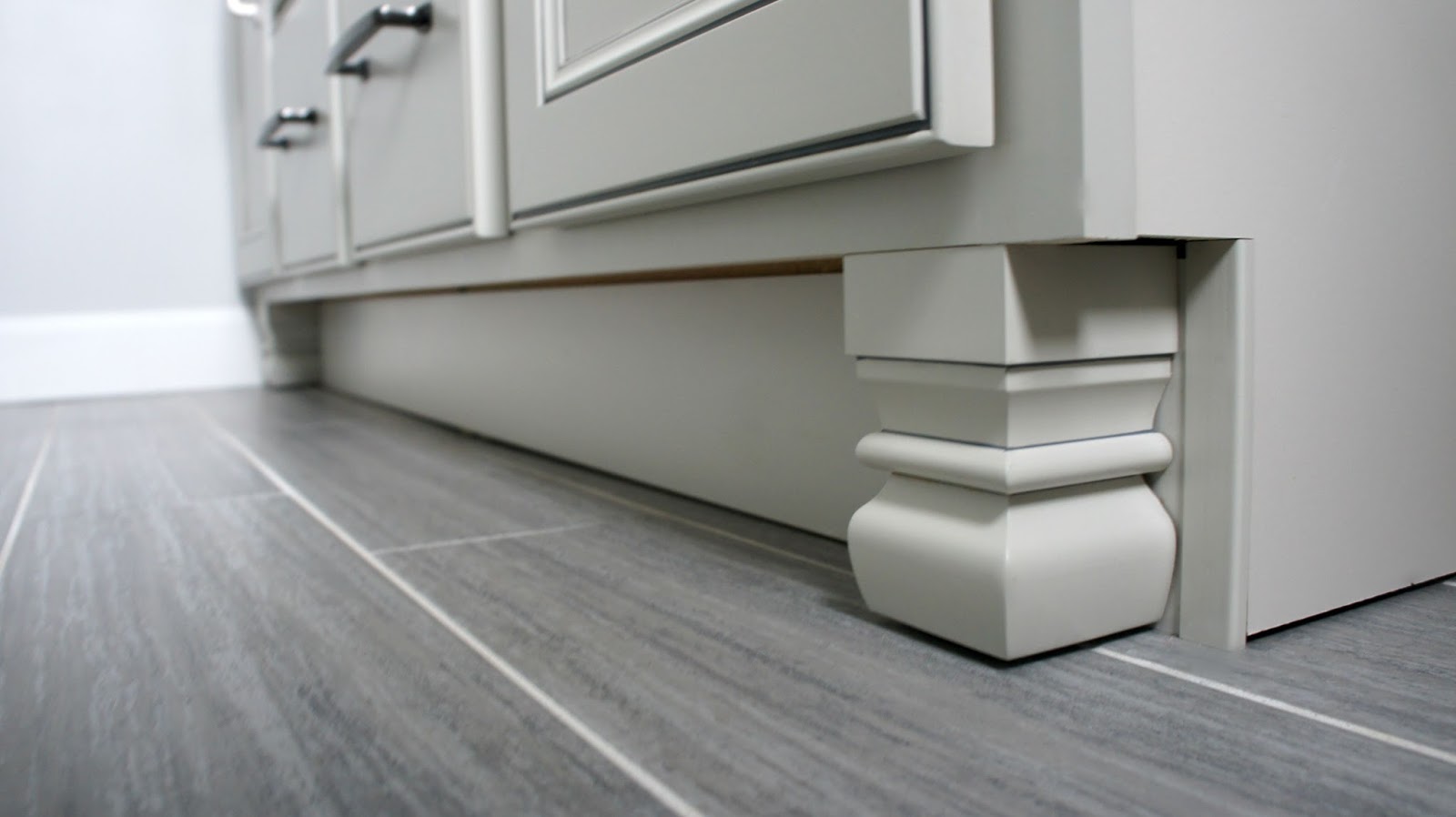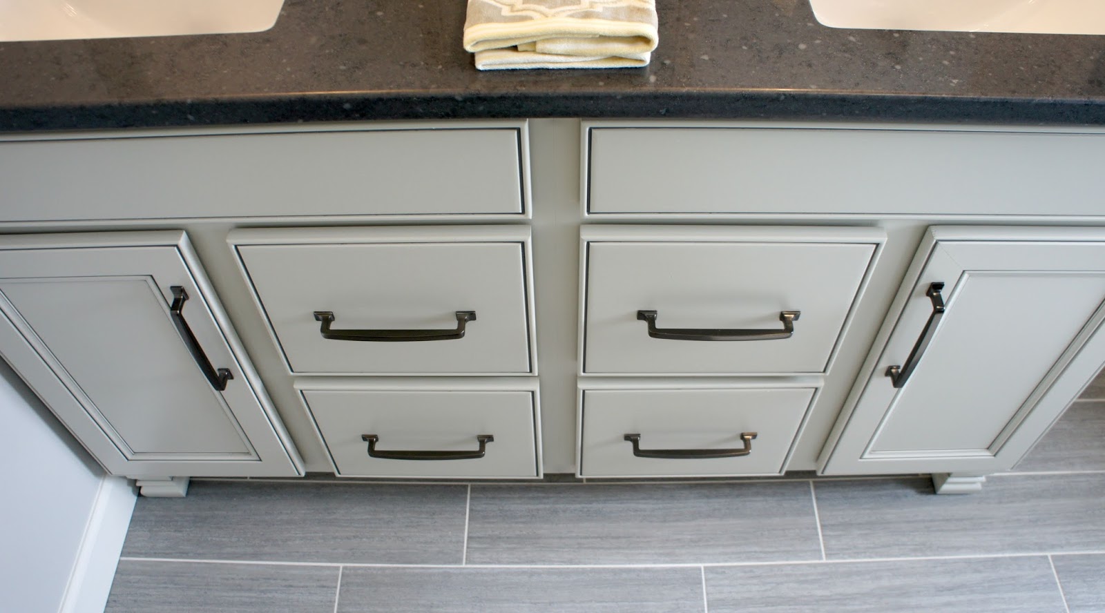 for our kitchen. In fact, we went with the same exact cabinets and hardware because we loved them so much. Because our house is lacking storage space like no other, I try to find ways to add more as we go. By adding in the cabinets up to the ceiling it did just that. The bottom one opens towards my sink and the top opens towards Shawn’s sink. We love the added space for all of our lotions, face washes, etc.