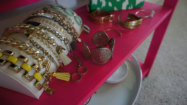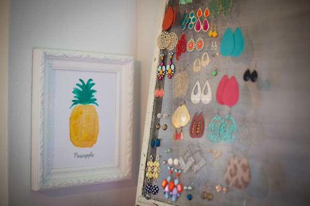Because we are limited in closet space at this house, I have to get creative with where I can store things. I decided to spray paint an old shelf that we have and then fill it up with all of my jewelry. I had also purchased an old window with a screen and use that for my earrings. It’s not only functional but cute! Winning.