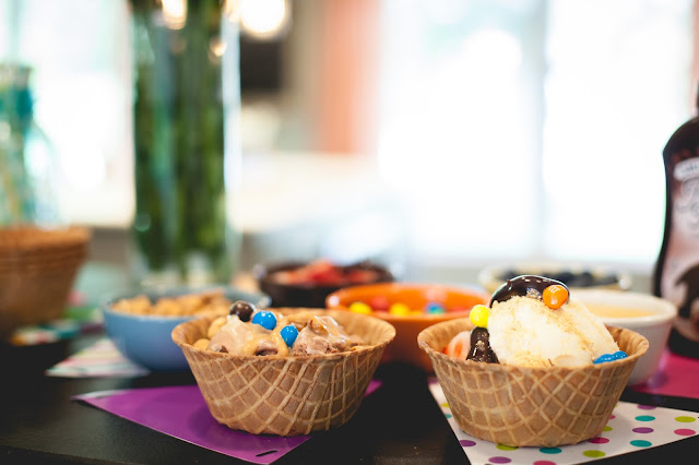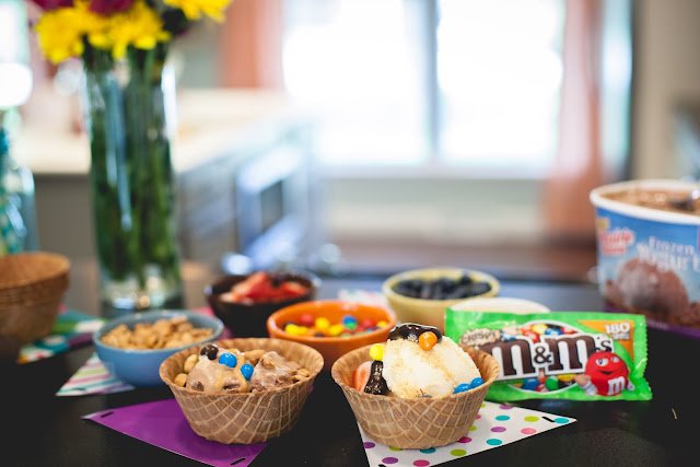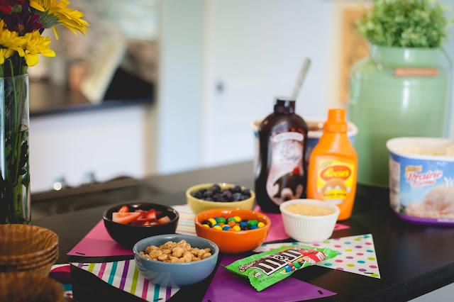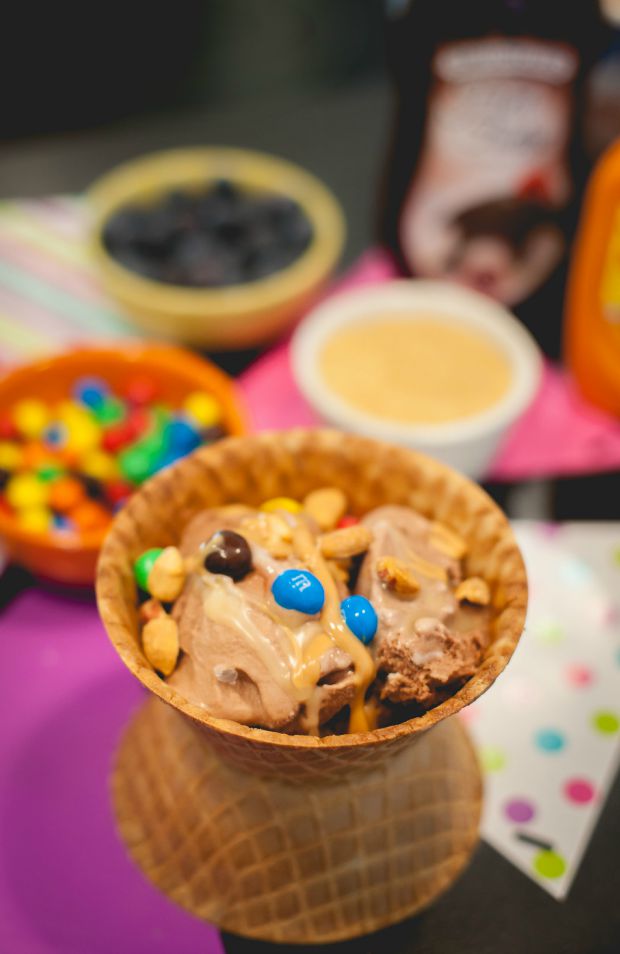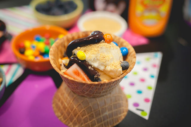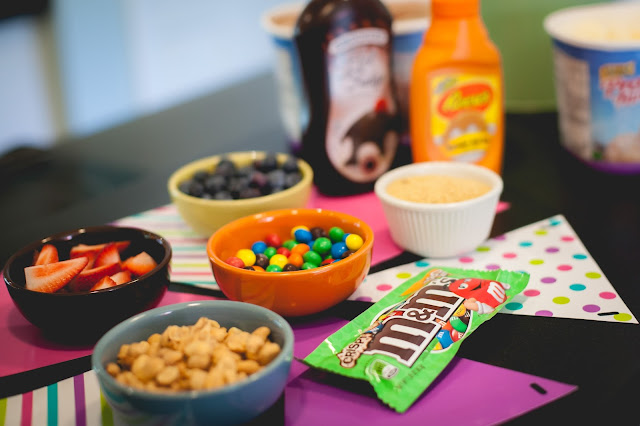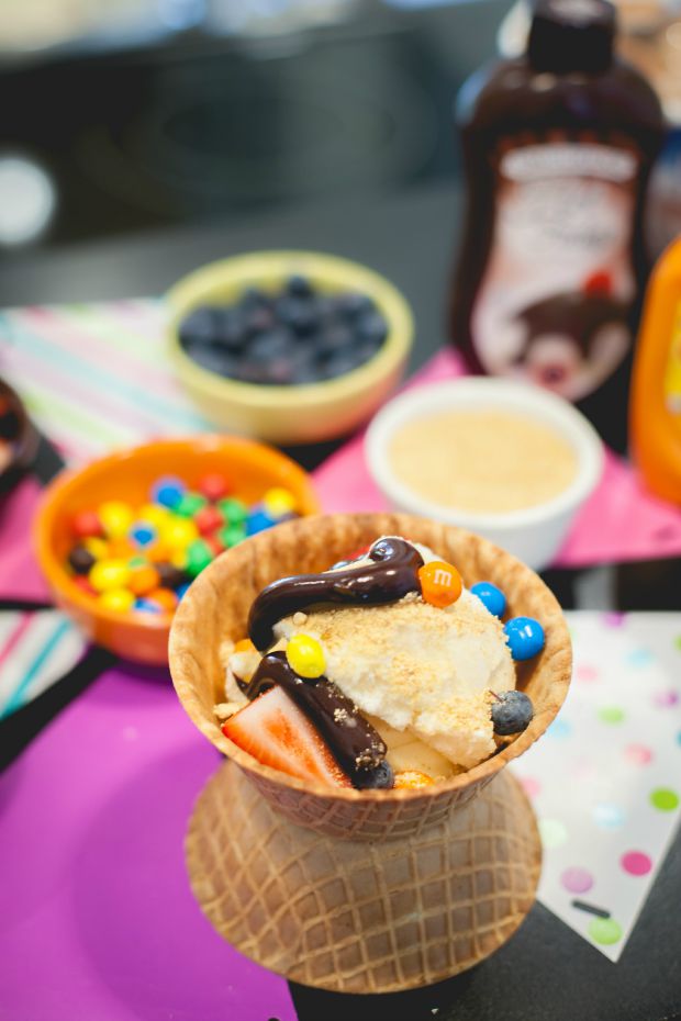 Vanilla and chocolate ice cream, waffle bowls, fruit, nuts, M&M’S® Crispy, graham cracker crumbs, chocolate and peanut butter syrup and we were set! To “lighten” things up a bit I did use frozen yogurt for the ice cream choices and made sure all of the toppings weren’t too heavy. Who knew that M&M’S® Crispy were only 180 calories per singles pack?! Yes please. I love the chocolate coated airy rice puff center that’s crispy and crunchy that they add to my already sweet treat.