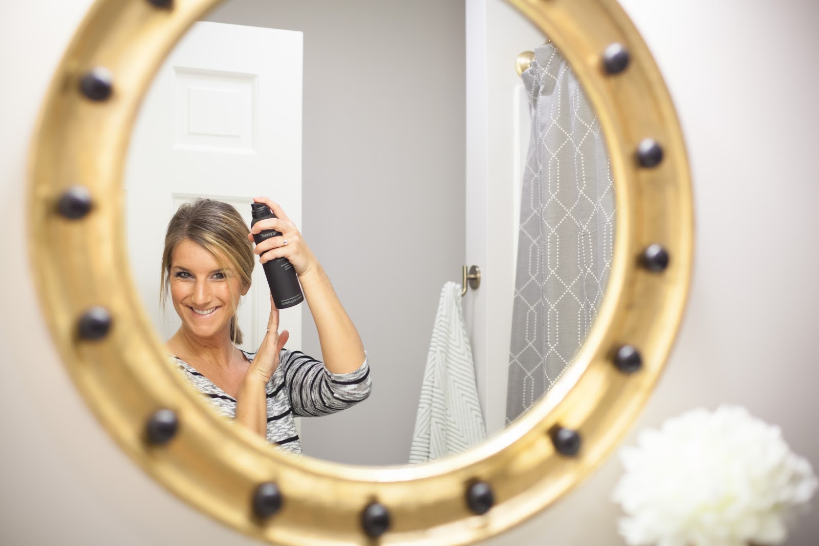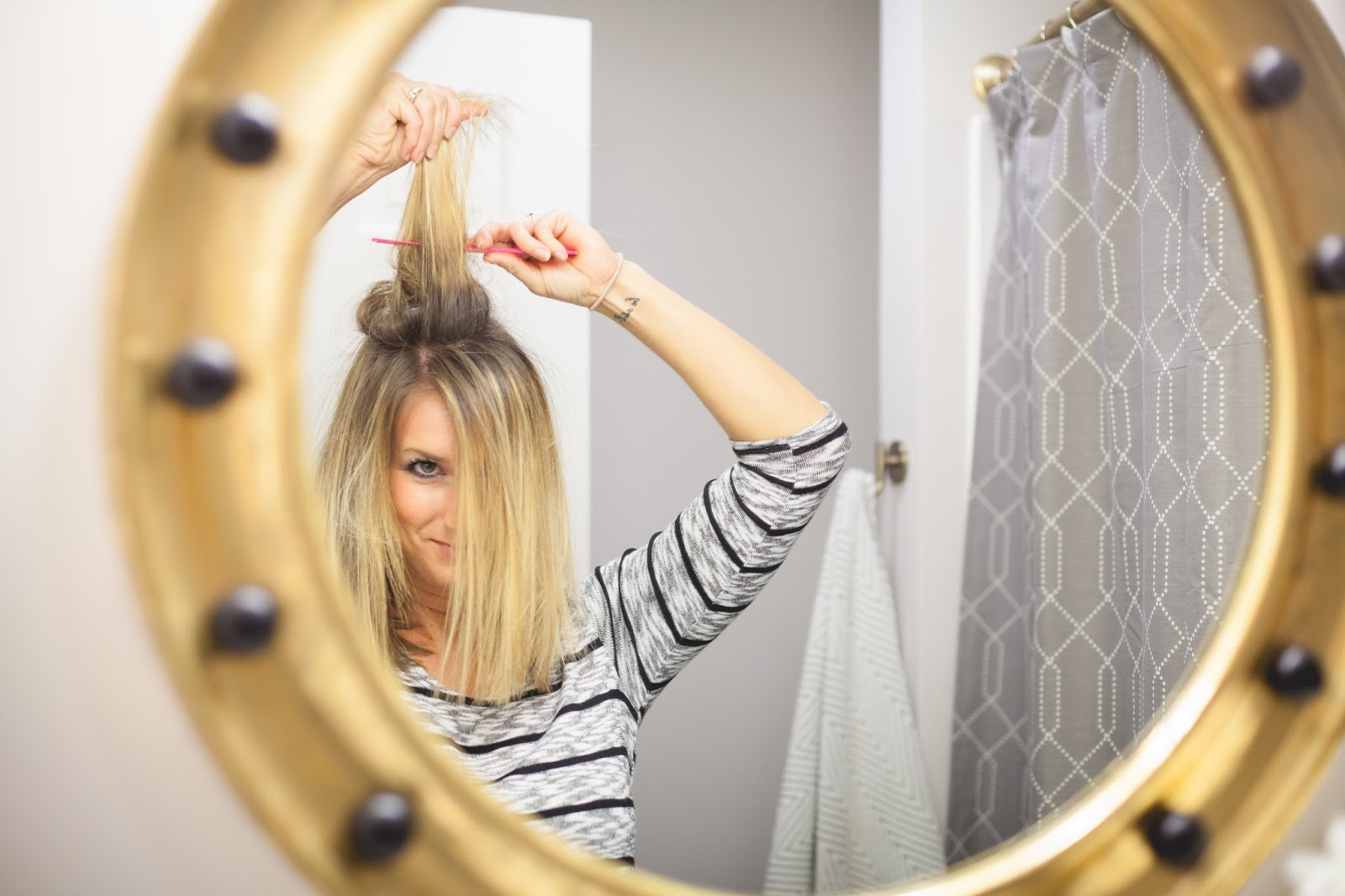 Once you have a giant puff ball sitting atop your head, gently brush over that madness to smooth it all and then very skillfully pull your hair back into a low ponytail. Because we need that masterpiece to stay in place, spray that sucker with hairspray like it’s your job [don’t worry, it smells delicious so you’ll be fine] and waaaaaaa-la. A ponytail with a little bit of oomph to it.