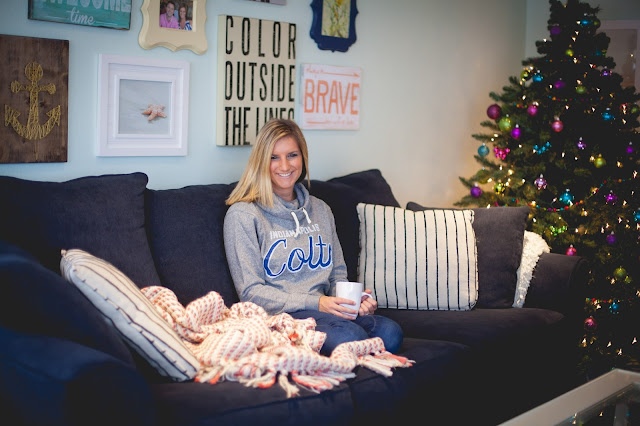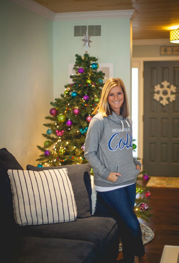Because I’m bound to believe that men love women the most when they are dressed in their favorite sports team apparel, I warmed up a bit by transitioning out of my cardigan and into my favorite Colts pullover hoodie, poured a hot cup of coffee, curled up under the blanket and let the heat of my computer radiate on my lap [great cheap and natural form of heat these days ;)] I love the NFL Shop and their trendy yet oh so comfy fan gear for cold weather apparel to keep us Indianapolis Colts fans happy and un-frozen.