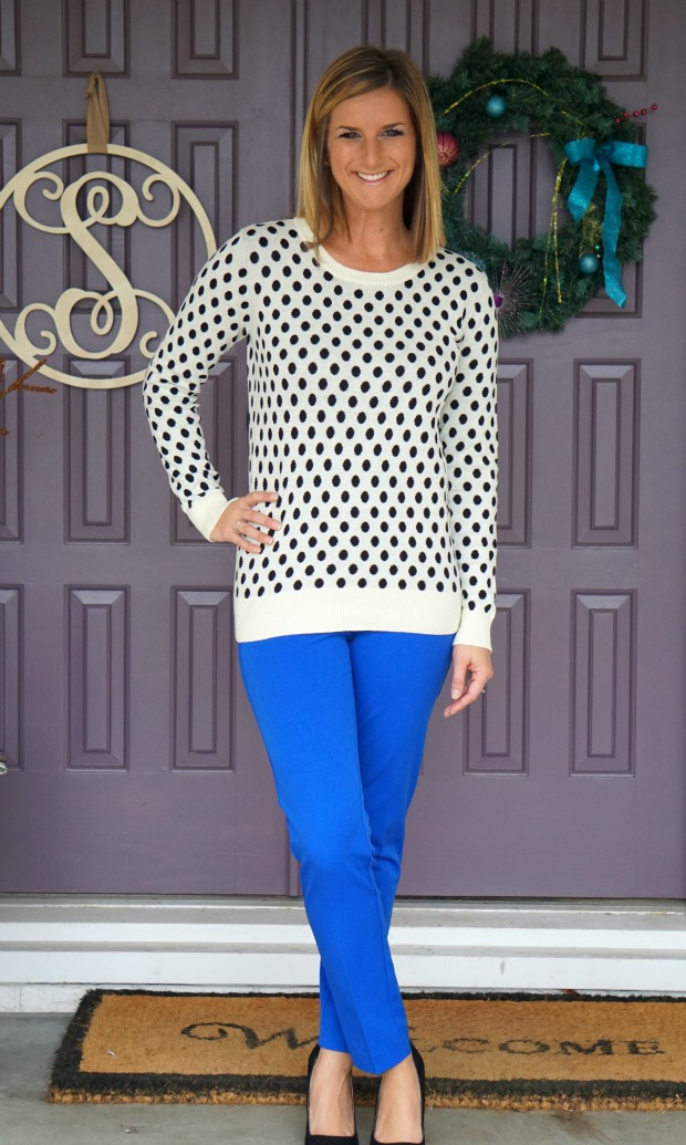 So this sweater was my husbands favorite. And if it weren’t for the incredibly bright blue in these pants [pretty sure the camera did that] I would like it better. It is so comfortable and would be perfect for work with bright [or heck, blue] pants. A little polka dot action never hurt anybody.