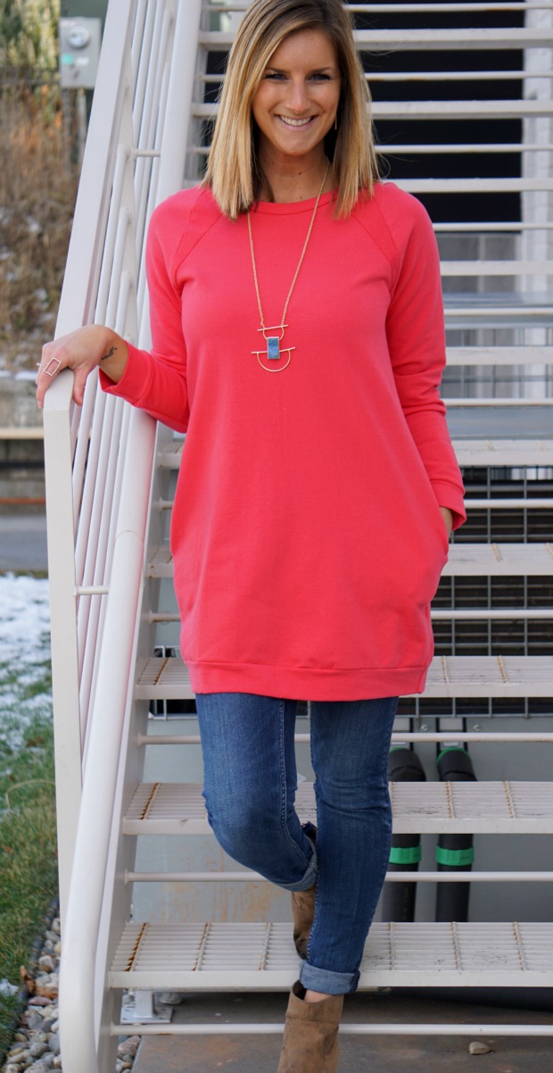 Love, Yellow items are sure to please. Because your typical sweatshirt comes in the same ole grey color and usually hits about waist high, we wanted to really throw the glitter in your face by offering you this vibrant coral tunic length sweatshirt. Does that mean you can wear it with leggings you ask? Is Santa real? Duh, you can wear that thing with leggings! Or heck, with jeans or with sweats or with nothing if you are a real sex pot. Perfect for busy days running errands or chilling around the house.