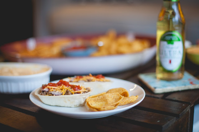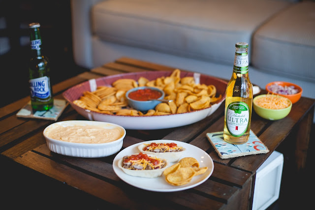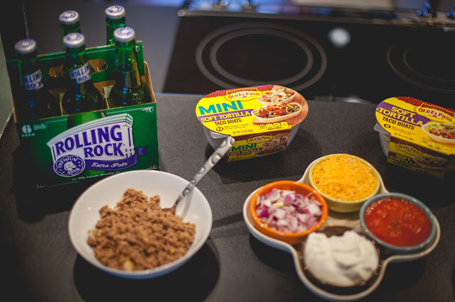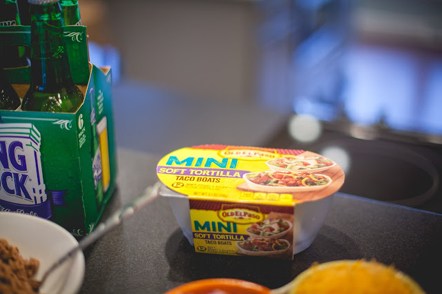 We are huge taco eaters in this house so when I saw the Old El Paso™ Mini soft tortilla taco boats at Walmart I was all “those are so cute! and fun! and not messy! I need them now!” so I brought them home, whipped up the easiest taco meat ever and busted out all of the fixings for our homegate festivities. Because every football game needs a beverage, I paid a visit to the trusted ole beer aisle and perused the giant Budweiser® selection. Michelob Ultra Cactus Lime [seriously, it’s so good] for me and Rolling Rock for him and we were all set.