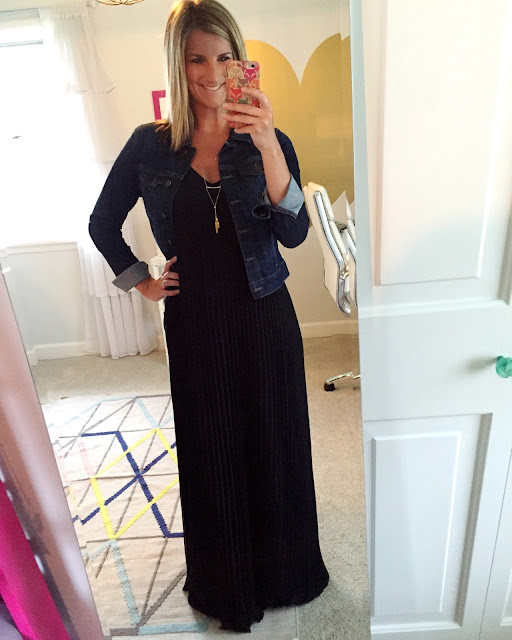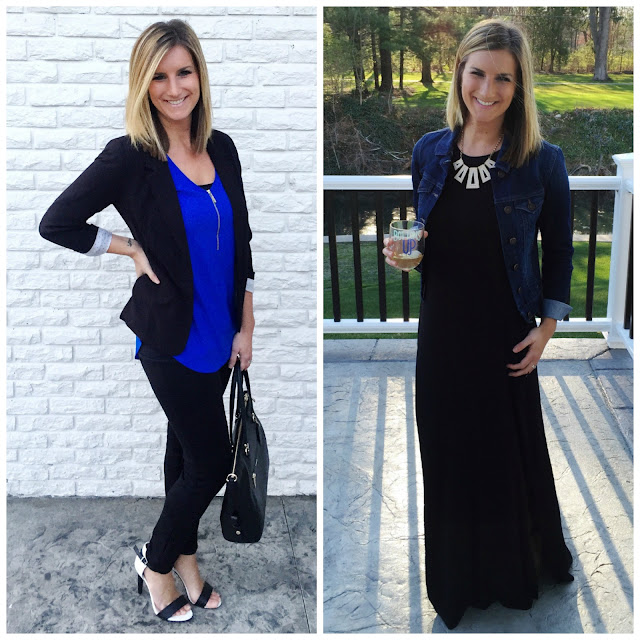 blazer [use code FRIEND for 25% off + free shipping] // blue top [buy one, get one 50% off, use code 1305 if you spend over $100 to get $25 off and free shipping] // pants // purse // heels [similar, on sale for $30] // maxi dress [sold out of black, available in grey] // denim jacket [best one I’ve ever owned!]