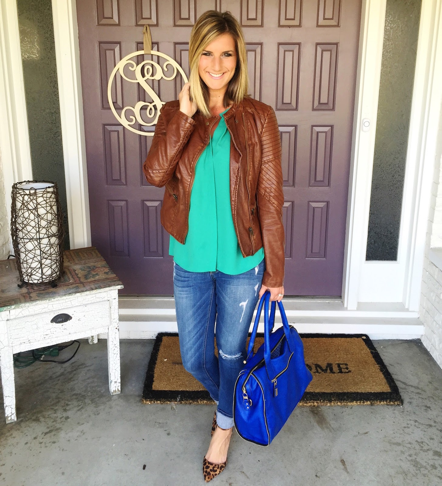 jacket – size up one if you teter between sizes [spend $50, save $10!] // green tank from stitch fix [similar] // jeans from stitch fix [similar, 40% off] // purse from stitch fix [similar] // heels [only $16.50!]