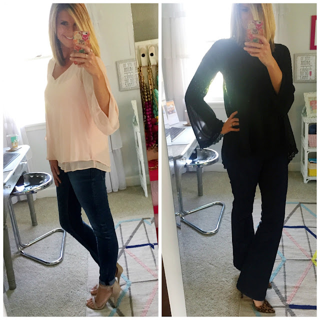 bell sleeve top [similar, 30% off only $17.50] // jeans from stitch fix [similar – currently 40% off] // heels [only $16.50]