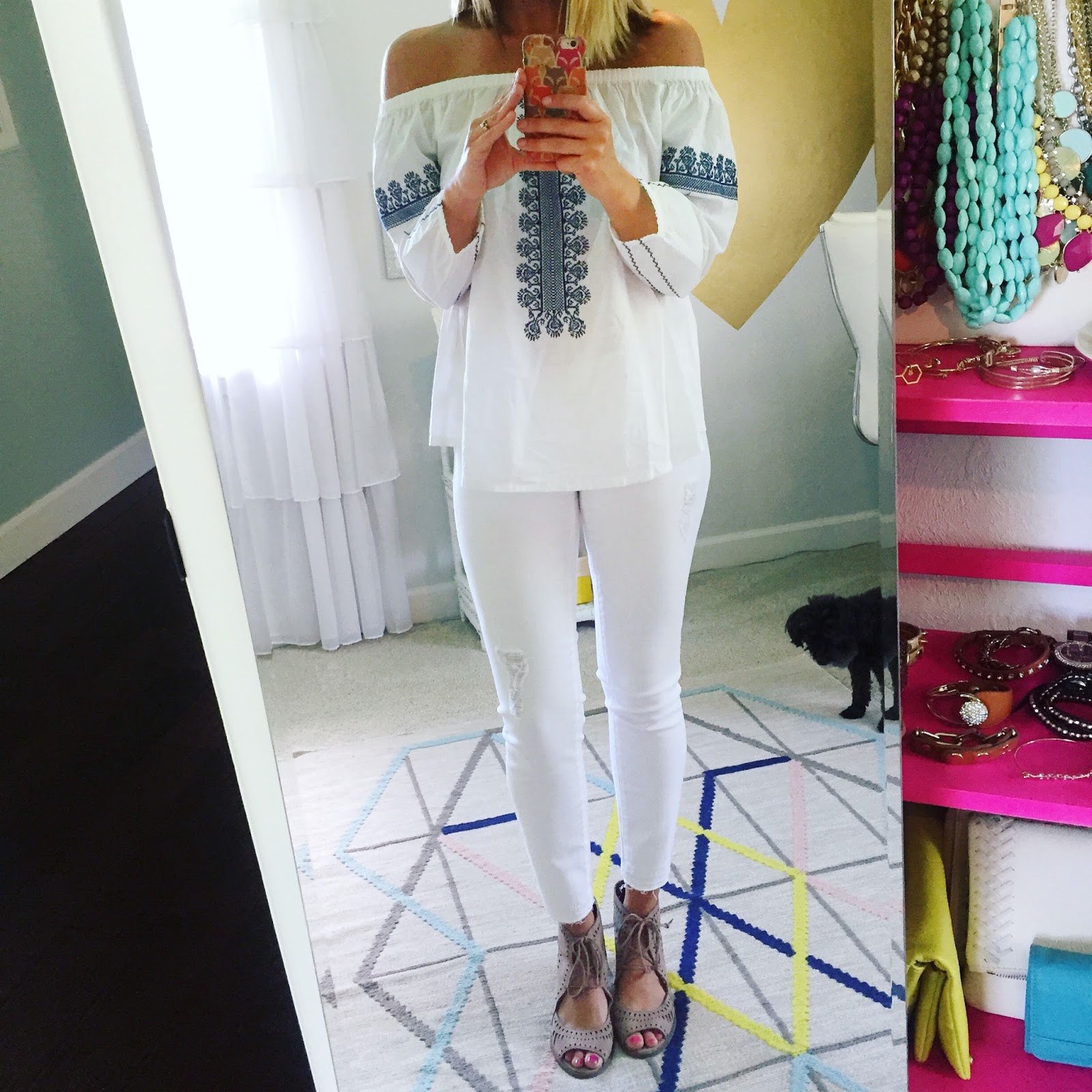 off the shoulder top [wearing an XS, currently 25% off!] // white cropped distressed jeans // lace up sandals