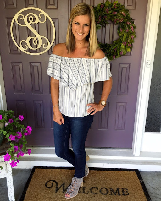 off the shoulder top [crosses in the back, super cute! wearing a size small, also available in pink] // shorts [buy 1 get 1 50% off] // similar sandals