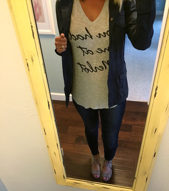 “you had me at merlot tee” [wearing a medium, currently on sale for $17.99!] // utility jacket // cropped jeans [currently 40% off! so comfortable and have a nice stretch, wearing a size 26 – if you teter between sizes, size down] // lace up sandals [wearing smoke cloud color]