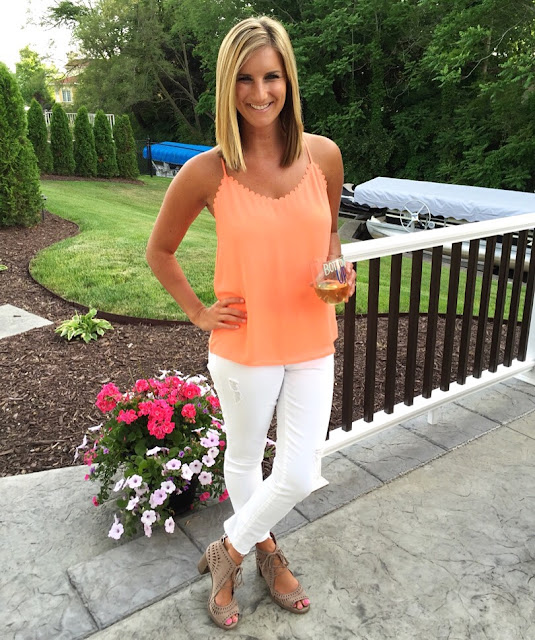 scallop tank – not available on the website but similar option here [wearing a medium] // cropped distressed white jeans [wearing a size 26, they do have a nice stretch to them and are so comfortable] // lace up sandals [wearing a size 8, available in 5 colors and SO comfortable and awesome!]